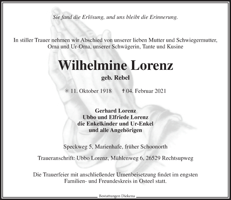 Hier finden Sie alle Traueranzeigen aus der Zeitung, die bisher für Wilhelmine Lorenz erschienen sind. Weitere Traueranzeigen, die in der Zeitung erscheinen, werden hier ebenfalls aufgelistet